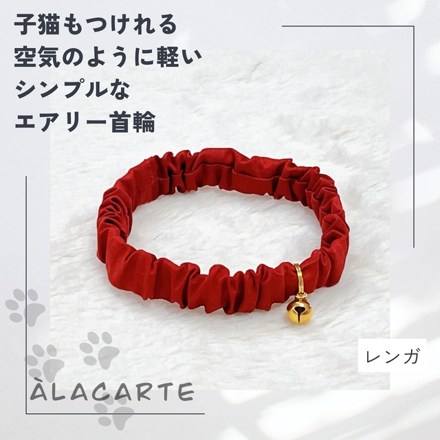 温もりを感じる「レンガ色」のクラシカルなエアリー首輪 ■ まるで空気のような軽やかさ ■ 素材には上質な「ローン」生地を使用しました。 猫ちゃんの肌に触れるものだから、とことん優しい肌触りにこだわりました。 上品な透け感は通気性も抜群で蒸れにくく 1年中いつでも快適な着け心地です ■ ÀLACARTEのこだわり ■ 「シンプルで軽く 猫の負担にならない」こと 首輪ハゲになりにくい優しい着け心地で 大切な猫ちゃんの毎日を快適にします ■ 優しい着け心地で首輪デビューにも ■ SSサイズは鈴ありで約1.5g(±0.5g) 空気のような軽さで生後1ヶ月の子猫から負担なく使え 柔らかな素材で着け心地も優しく 首輪嫌いの猫ちゃんも「嫌がらず着けてくれた!」と 嬉しいお声を多数いただいています ※安全を100%保証するものではありません 飼い主様の目の届く範囲でご使用ください。 ※安全のためにもサイズ選びは重要です サイズが小さい又はピッタリすぎると抜けにくくなるため 適切なサイズをお選びください ※首輪による万が一の事故責任は負いかねます ーーーーーーーーーーーーー ■ 選べる6サイズ ■ SSサイズ~3Lサイズ 《SSサイズ・Sサイズは別ページにて販売中》 SS・Sサイズ➡ https://alacarte22.theshop.jp/items/116495145 《幅》 約1.2~1.5cm 《首輪内周》 約13cm・SSサイズ 約16cm・Sサイズ 約18cm・Mサイズ 約20cm・Lサイズ 約22cm・LLサイズ 約24cm・3Lサイズ ・ヌードサイズより+2cm~+4cm(毛の長さによる)が理想です。 ・首周りをピッタリ測った長さに指2本分が入るくらいの余裕を取ってください ⚠長さ調節ができません ■ 鈴について ■ 優しい音色の鈴で音に敏感な猫さんでも付けやすい鈴となっております ゴールド・シルバーからお選びください 価格は変わりませんが鈴・金具不要もお選びいただけます ※鈴無しでチャームなどを付けたい方は 購入後にご自身で鈴を取り外してご使用ください --------------------------------------------------------------- ■ 素材 ■ 生地 :ローン綿100% ゴム : 平ゴム12コール約10mm幅 鈴 : 宝来鈴 ■ 注意事項 ■ 商品のカラーは実際に近い色で載せておりますが ご使用のモニターによっては実物との違いが生じる場合がございます。 手作り商品となりますので 縫い目の誤差、歪み、ズレなど生じる場合がございますがひとつひとつ丁寧に手作りしております。 ±1cmの誤差はご了承ください。 また、わが家では喫煙者はいませんが猫を3匹飼っております。最新の注意を心がけておりますが細かな事が気になる方は購入をお控えください。
