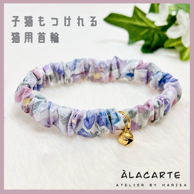 【パープル】LIBERTY生地使用・子猫もつけれるシンプルで軽い猫用シュシュ首輪